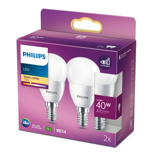 Pack of 2 Philips LED E14 P45 teardrop shape 5.5W = 40W 470lm warm white 2700K